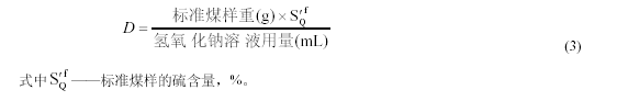 氫氧化鈉溶液的配制:稱(chēng)取優(yōu)級純氫氧化鈉(GB 629—77)6g,溶于5000mL 經(jīng)煮沸后冷卻的蒸餾水中,混合均勻,裝入瓶?jì)?,用橡皮塞塞緊。稱(chēng)取0.2g 左右的標準煤樣(稱(chēng)準到0.0002g),置于燃燒舟中,再蓋上一薄層三氧化鎢催化劑。然后按第3.4 條的試驗步驟進(jìn)行試驗,最后記下滴定時(shí)氫氧化鈉溶液的用量。氫氧化鈉溶液的滴定度(硫的克數/毫升)由式(3)計算: