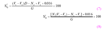 注:①實(shí)驗中如果不采用氫氧化鈉溶液滴定度的計算方法,則需配制和標定硫酸及氫氧化鈉標準溶液,采用最后結果乘或除以一個(gè)系數的方法,即:SfQ<1%,結果除以1.05;SfQ>4%,結果乘以1.05;SfQ=1%~4%,結果不變。